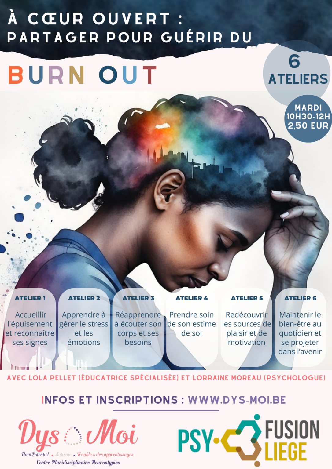 Ce module de 6 ateliers offre un espace de parole bienveillant où chacun peut s’exprimer librement sur son vécu face au burnout. À travers des échanges sincères et authentiques avec d’autres personnes vivant une situation similaire. Ce module propose des exercices thérapeutiques guidés par deux thérapeutes afin d’aider chaque participant à explorer ses ressentis, à comprendre les causes profondes de son épuisement, et à développer des stratégies de gestion du stress. Des outils pratiques tels que des techniques de relaxation, des exercices de pleine conscience, et des visualisations guidées seront proposés pour permettre à chacun de repartir avec des ressources concrètes pour mieux se préserver et se reconstruire. Ce module est une invitation à ouvrir son cœur, à se libérer du poids de l’épuisement, et à puiser dans la force du groupe pour amorcer un chemin vers un mieux-être durable. inscription: https://dys-moi.be/agenda/