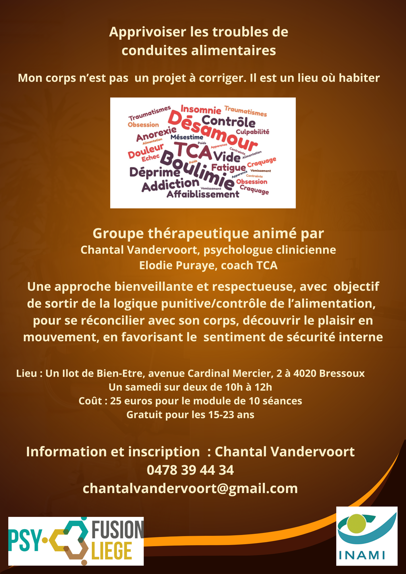 Ce groupe thérapeutique propose un accompagnement des personnes en difficulté dans leurs comportements alimentaires. Il s’agit d’une approche bienveillante et respectueuse, avec pour objectif de sortir de la logique punitive/contrôle de l’alimentation, pour se réconcilier avec son corps, favoriser le plaisir dans le mouvement, en apportant un meilleur sentiment de sécurité interne. Nous aborderons les notions de vulnérabilité et honte sociale, flexibilité et appréciation de l’image corporelle, théorie de l’objectivation, l’alimentation intuitive, la régulation émotionnelle, l’intéroception, la théorie polyvagale.