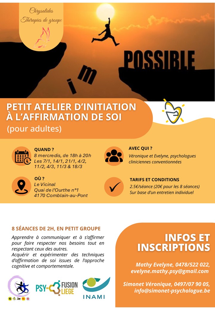 Améliorer les compétences psychosociales au niveau relationnel : apprendre à être plus à l’aise dans les situations de conversation, à exprimer et à répondre à des demandes, à faire et recevoir des compliments, ainsi qu’à exprimer et faire face à des critiques. Méthodologie: Psychoéducation sur la communication verbale et non verbale, les 4 types d’affirmation de soi et l’assertivité, le lien entre l’estime de soi et affirmation de soi, la CNV, les causes et les facteurs du maintien du manque d’affirmation de soi, la gestion du stress en situation relationnelle. Approche TCC: Techniques JEEP, DESC, ERD, OSBD, méthodes pour formuler un refus, résoudre un conflit, répondre à une critique destructrice. Jeux de rôles, restructuration cognitive (pensées/émotions). Charte de respect et de confidentialité pour tous les participants.