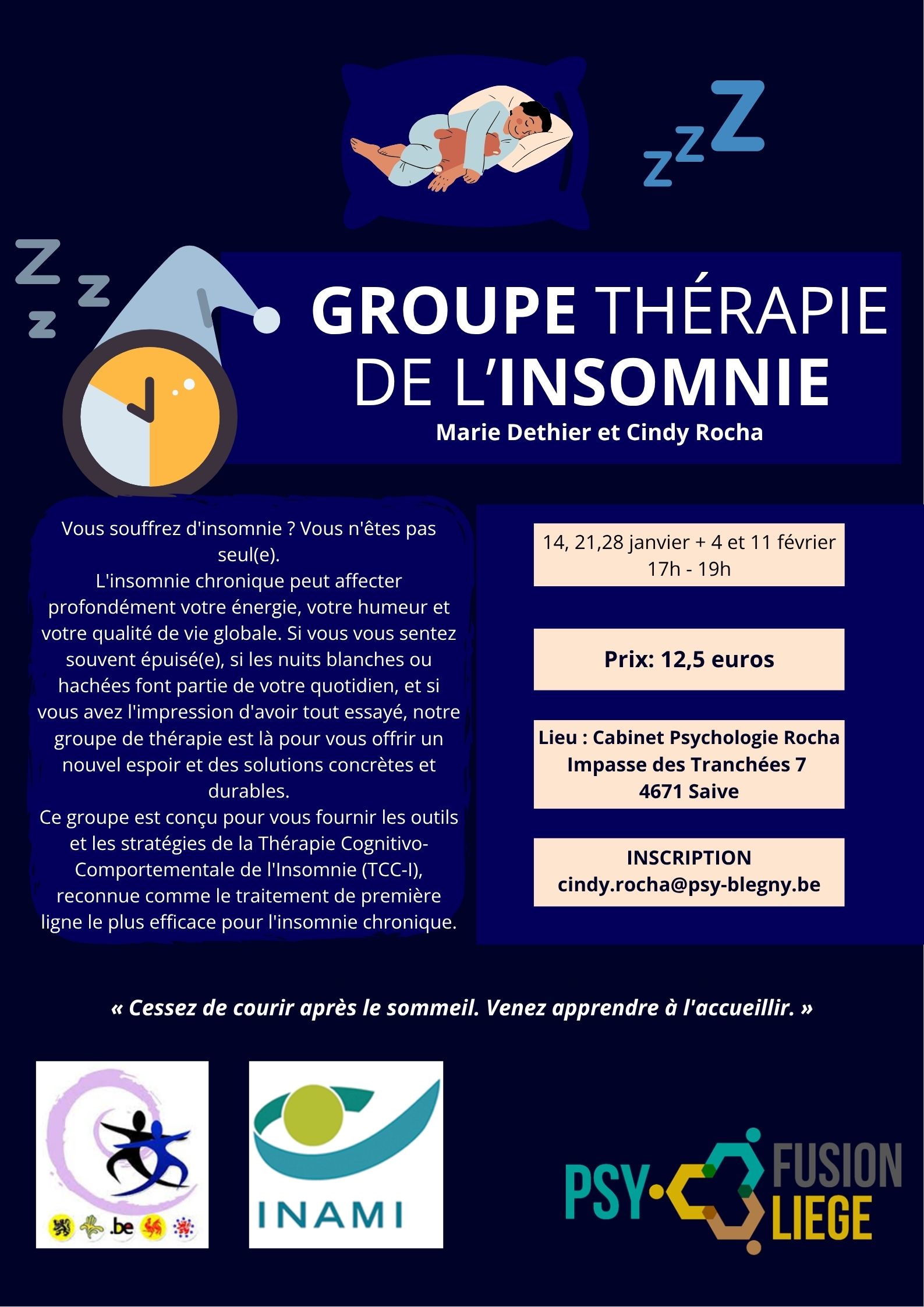 Vous souffrez d’insomnie? Vous n’êtes pas seul. L’insomnie chronique peut profondément affecter votre énergie, votre humeur et votre qualité de vie globale. Si vous vous sentez souvent épuisés, si les nuits blanches ou hachées font partie de votre quotidien, et si vous avez l’impression d’avoir tout essayé, notre groupe de thérapie est là pour vous offrir un nouvel espoir et des solutions concrètes et durables.
